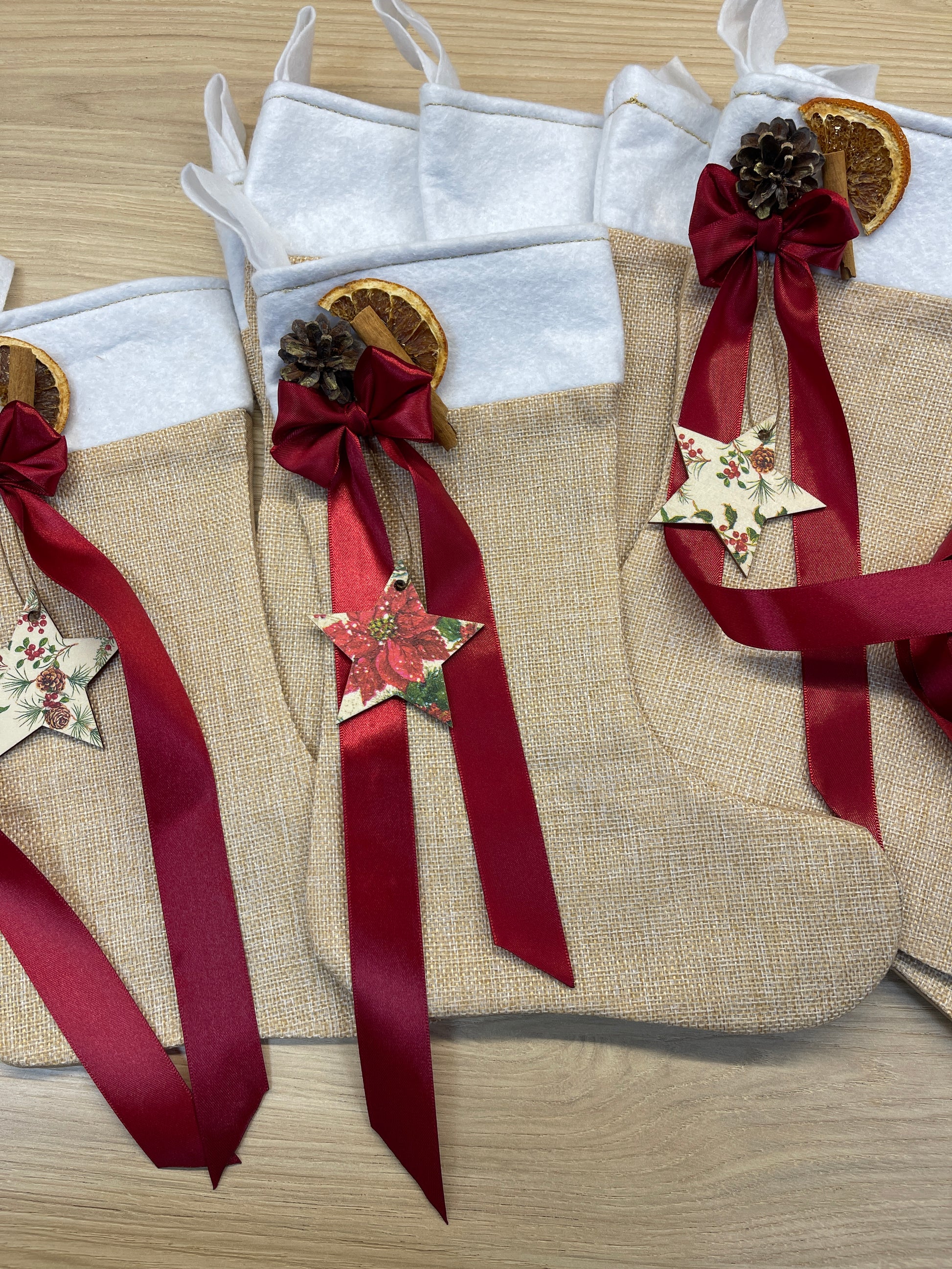 Esta bota incluye lazo rojo largo con topings navideños , una estrella con decopach y el nombre o palabra personalizado en dorado en la parte superior derecha de la bota