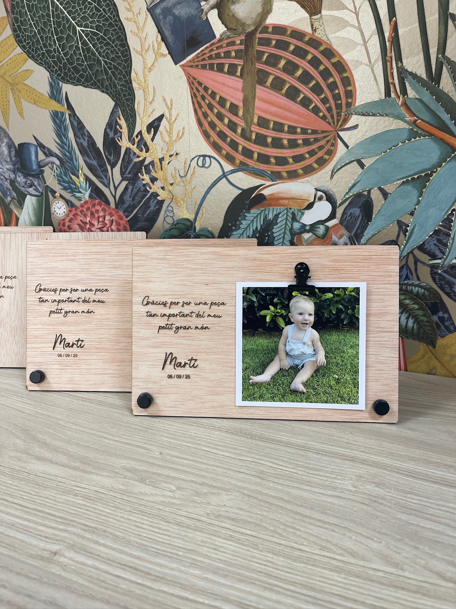 Marco tallado en madera de haya con frase grabada al gusto y pinza para que puedas cambiar la foto siempre que quieras y dos soportes , diseño siempre horizontal