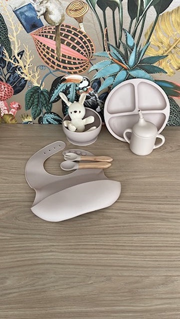 Este pack incluye el grabado en los cubiertos y esta compuesto por un plato fondo con tres apartados con ventosa en la parte de abajo para evitar que se caiga cada dos por tres ;) un vasto con pajita, un bol, un babero y un pequeño muñeco